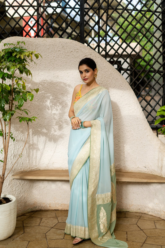 BANARASI KHADDI GEORGETTE SAREE IN AQUA & SAGE