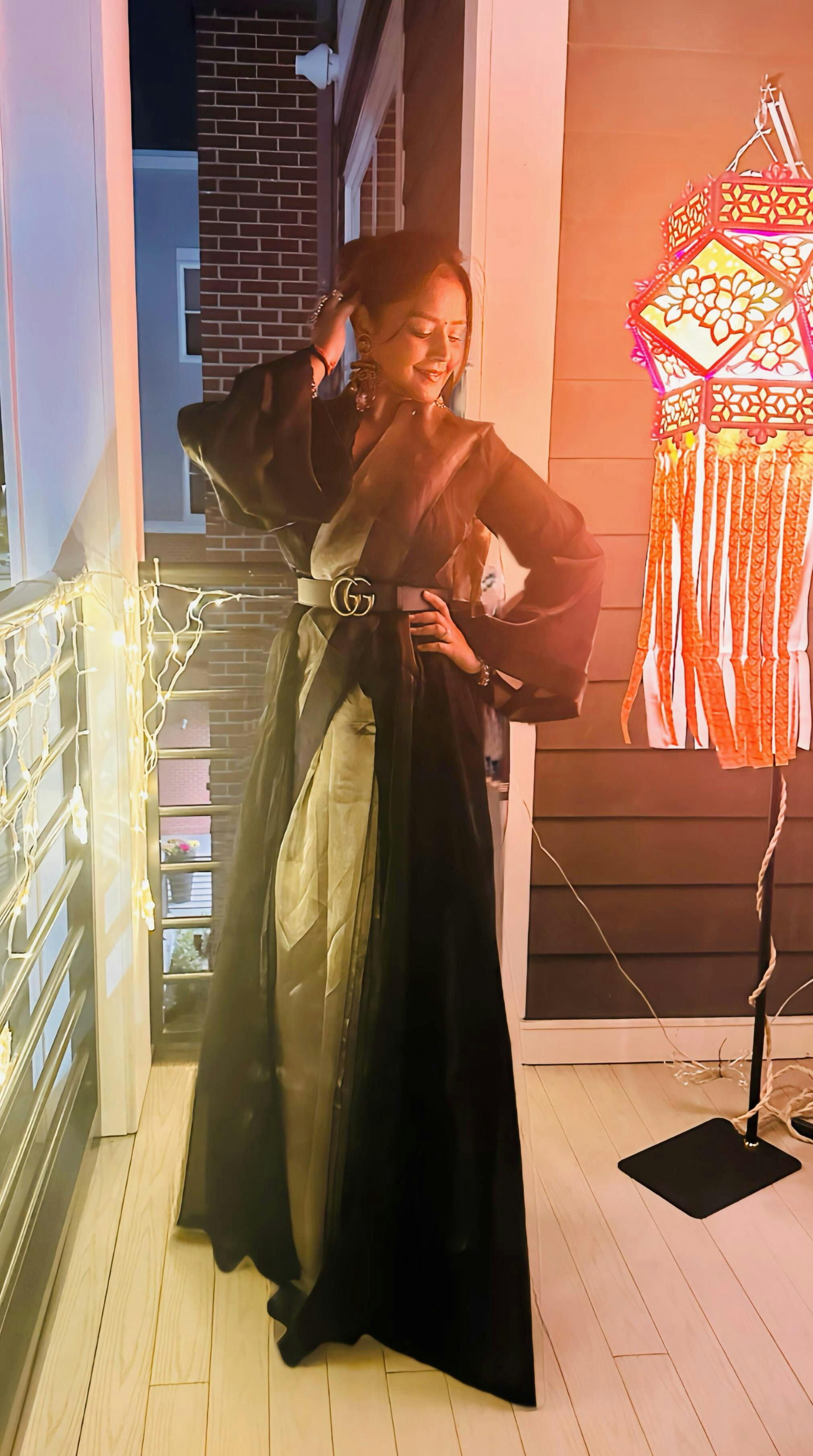 Crafted in Banaras, each thread carries the weight of centuries-old craftsmanship. A bold black border grounds the delicate texture, creating a silhouette that’s both ethereal and empowered.
