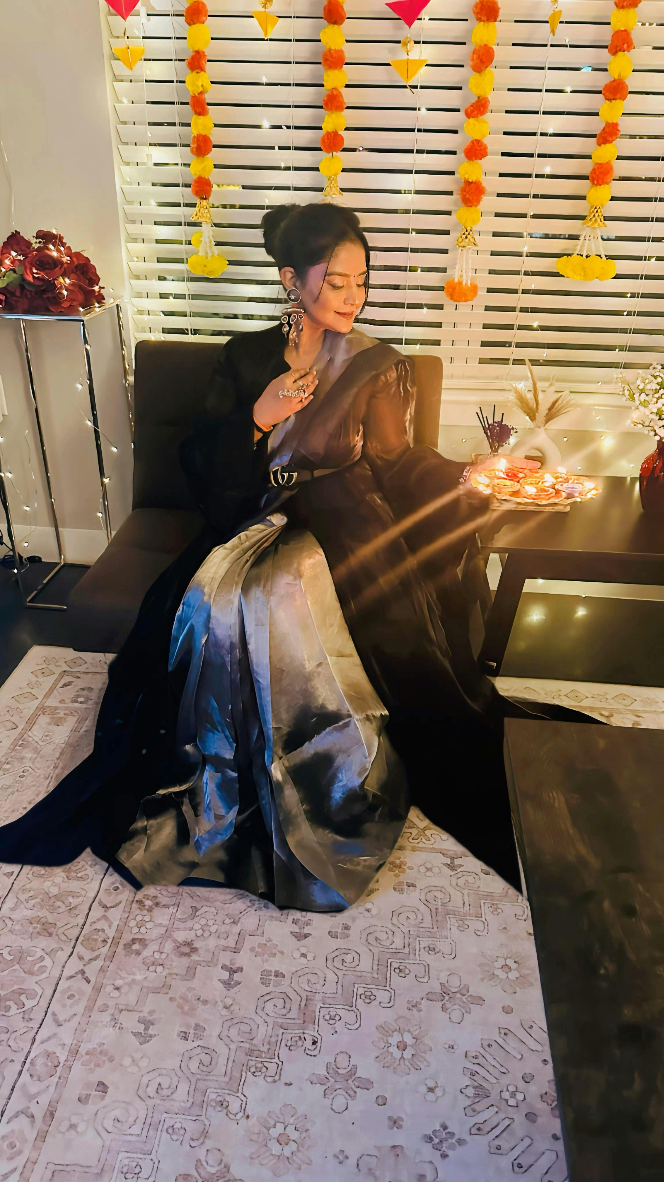 BLACK GLASS TISSUE SILK SAREE WITH SHRUG