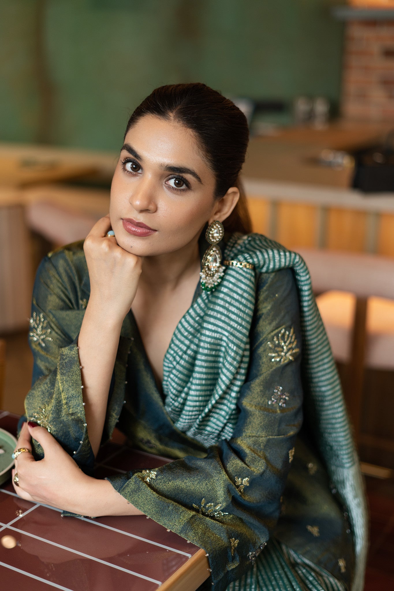 An elegant drape that beautifully blends Banarasi tradition with a modern sheen. Handcrafted in pure Moonga Silk, this saree features delicate tissue stripes that create a subtle shimmer and graceful flow. It comes with a solid crushed tissue blouse piece, giving you the freedom to style it traditionally or with a contemporary twist.