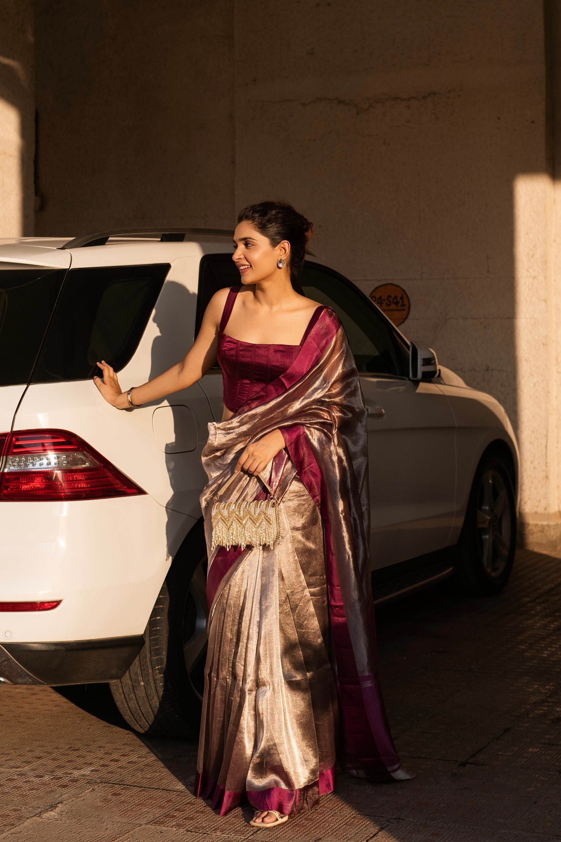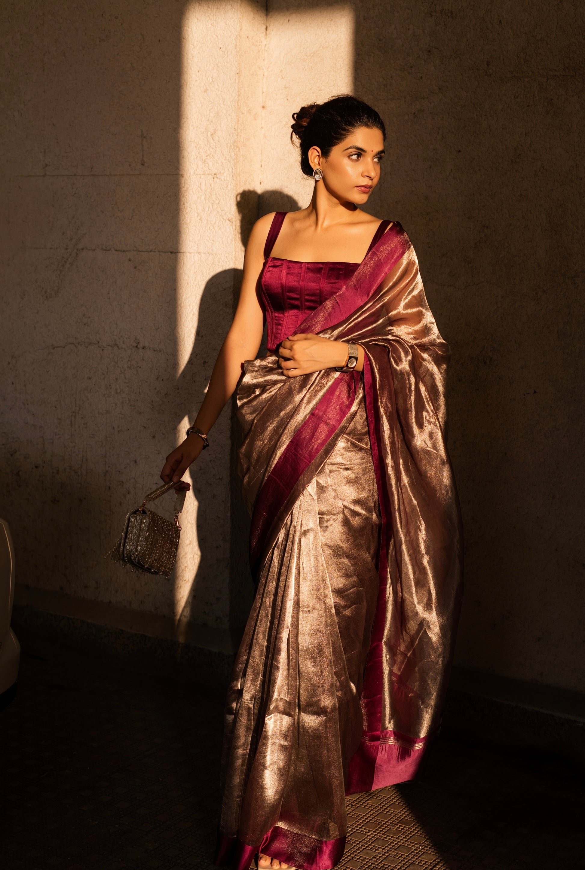 This exquisite saree is crafted from delicate glass tissue, featuring a luminous rose gold body that shimmers with understated elegance. The plum-toned border and pallu add depth and richness, creating a striking contrast that balances modern glamour with traditional charm. Lightweight, luminous, and easy to drape, this saree transitions effortlessly from daytime celebrations to evening soirées.